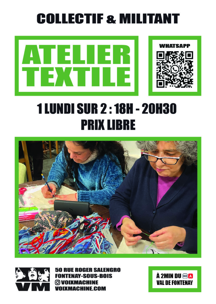 VOIX MACHINE ouvre ses portes pour accueillir, diffuser, tisser et échanger des fils, des tissus et des récits sur le textile et la couture, de toutes les cultures qui transforment aujourd’hui le textile en un outil/artisanat pour défendre et revendiquer la vie, les territoires, les droits humains, l’antiracisme, l’égalité de genres, la solidarité… Partageons des savoirs et nos matériels pour réaffirmer à travers les pratiques textiles nos luttes militantes.