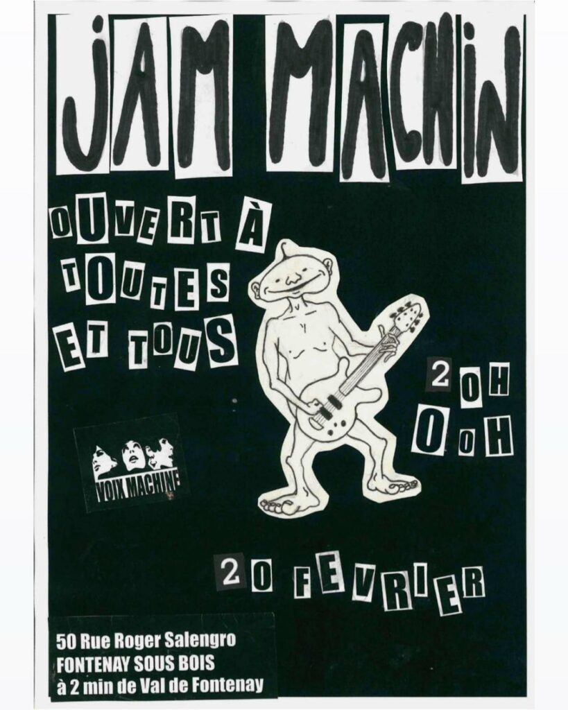 L’idée c’est de faire une jam inclusive, de melanger les styles, les niveaux, pour faire de la musique tous ensemble et que tout le monde y prenne du plaisir ! Elle est donc ouverte aux moins bons qui souhaitent évoluer dans leur pratique et aux meilleurs qui souhaitent les accompagner dans cette démarche. 💥Elle servira également a l’évolution des autres projets musicaux de Voix Machine (Salle de répétition et Studio d’enregistrement) en finacant du matériel pour l’instant inexistant ou non péren. 🔥Rdv le 20 fevrier, de 20h a 00h au 50 rue Roger Salengro a Fontenay sous Bois