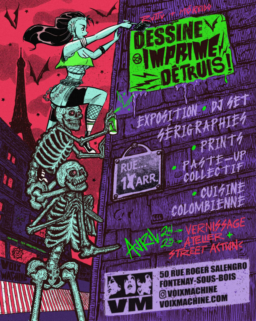 Deux jours de: •Exposition •DJ sets @lasabrote_k •Bar et cuisine colombienne •Vente de sérigraphies & prints •Atelier militant + paste-up collectif dans la rue.